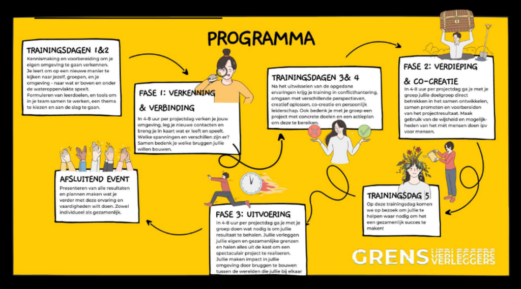 50% van de tijd ga je de geleerde vaardigheden gebruiken om samen een nieuw, verbindend initiatief te bedenken en te realiseren dat een verschil gaat maken op de plek waar jullie dit nodig vinden